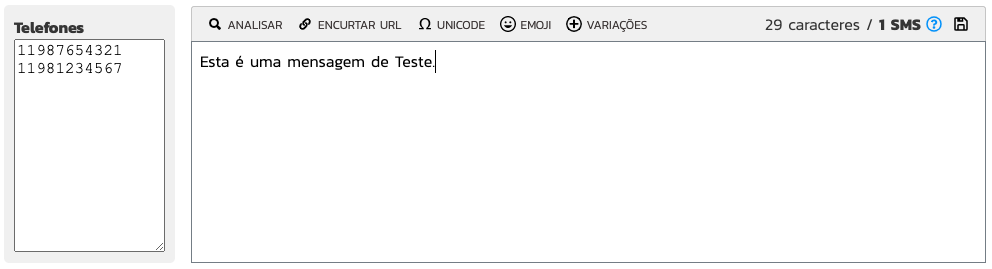 | Analisar | Analisa a mensagem de SMS e informa caso haja erros ou restrições no envio de acordo com o conteúdo. |